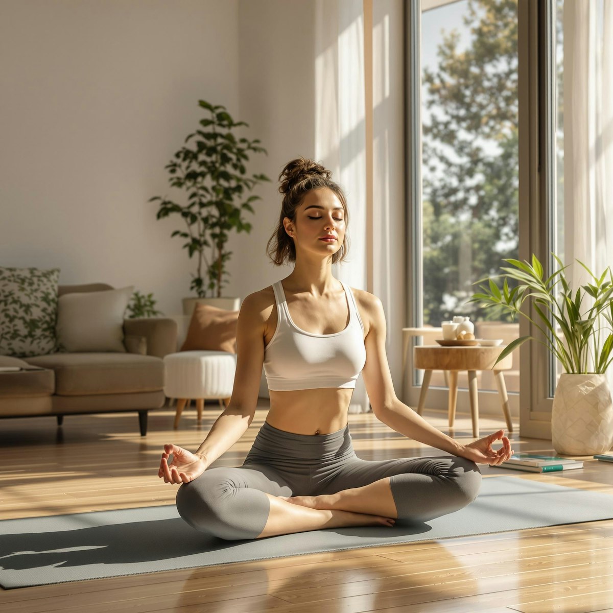 A yoga mat, comfortable fitted clothing, and a small towel. Optional props like a Pilates ring or light weights may be used.
